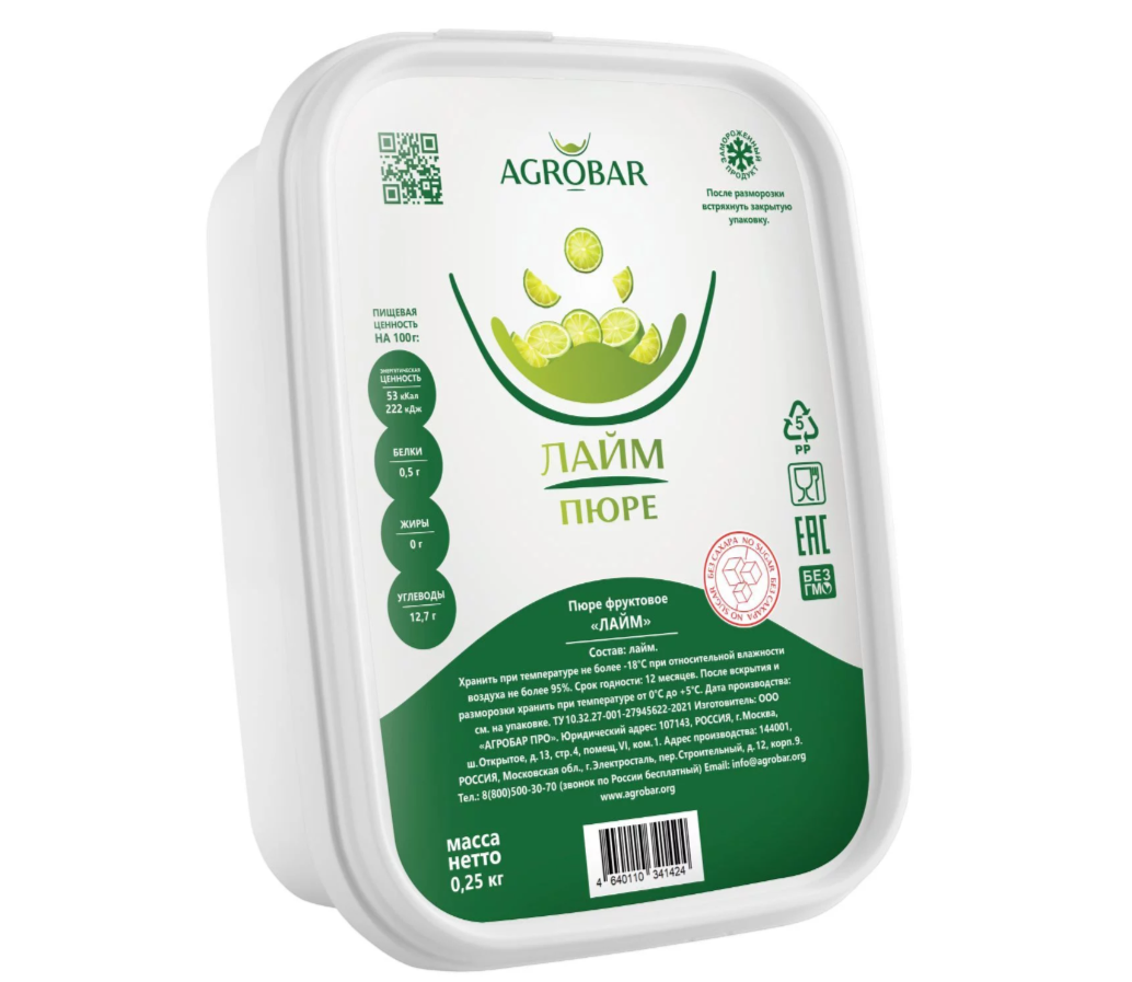 Пюре "АГРОБАР" ЛАЙМ 90% фруктов, 0% сахара, Россия (0,250 кг.)