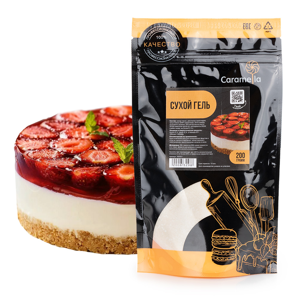 Сухой гель - для быстрого приготовления прозрачного геля, желе и создания блестящей поверхности изделий желейного слоя тортов, пирожных. Также используется для защиты фруктов и ягод от заветривания и высыхания. Устойчив к замораживанию и дефростации, используется как основа для приготовления желейных прослоек для тортов.